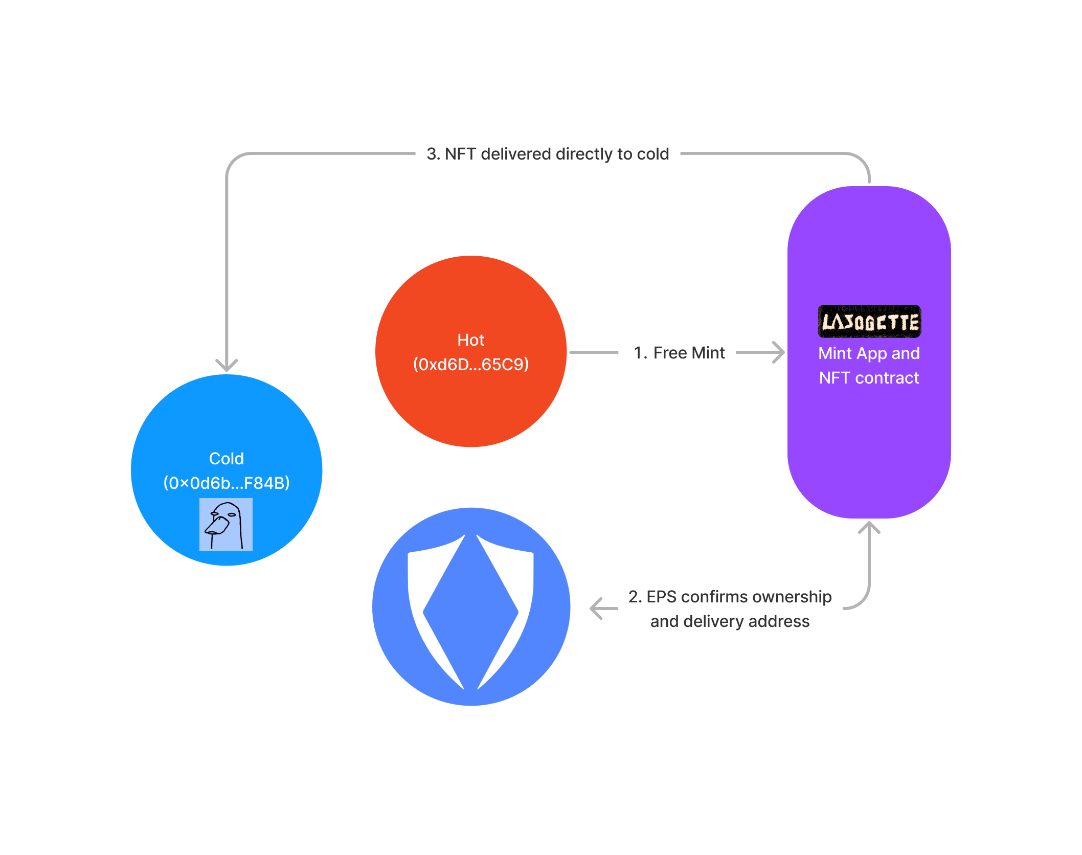 The user also has their EPS delivery address set as their cold wallet. That means the new Lasogette NFT was delivered directly to their cold wallet. It never even touched the hot wallet.