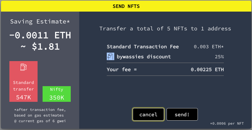 Niftymove's low fee can be made even lower with a holding discount or referral code.