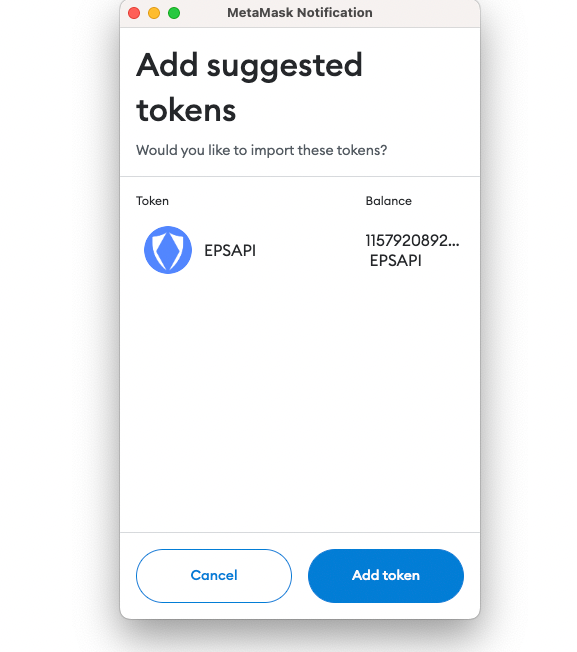 Click "Add token" to add the EPSAPI token to the wallet you have open (remember, this should be your COLD wallet, the one with the valuable stuff in that you don't want to connect to apps).
