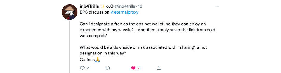 By splitting benefit from ownership we allow the fun thing that inb4Trills is suggesting. We can lend the benefit of an NFT to a friend with no fear that the asset will be lost. It's still in our wallet.